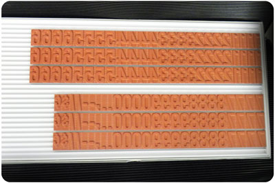 In the RIBtype® system, ribs on the back of the type interlock with ribs on the marking device. This allows for fast changes of text for date coding and lot number changes. Graphics can also be incorporated in the type for product and brand identification.